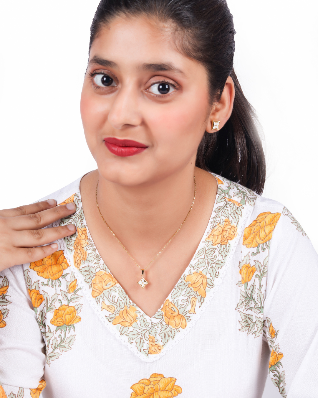 Featuring a polished chain with delicate pearl accents and matching earrings, this set brings a soft glow to every look. The design is minimal yet sophisticated, making it perfect for weddings, festive gatherings, or elevating your everyday style.