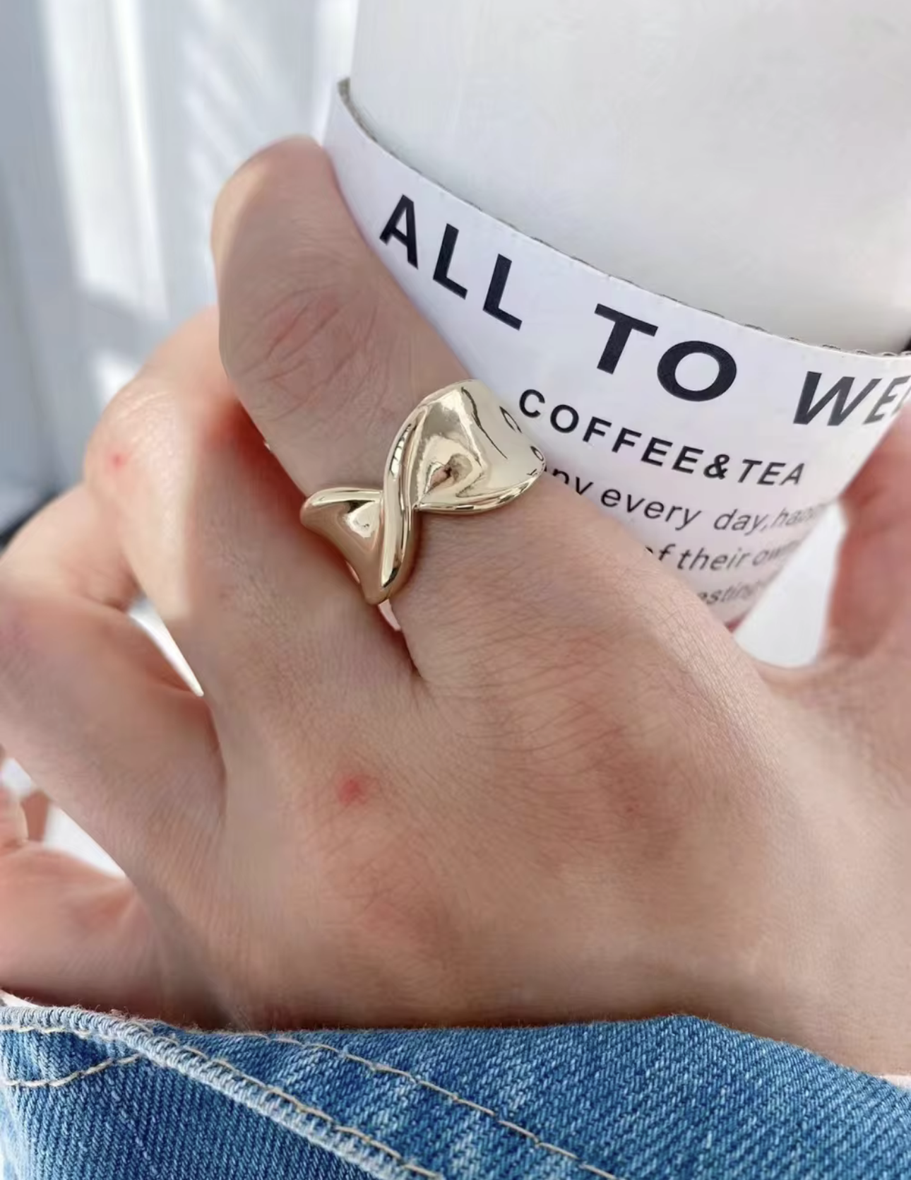 Designed with fluid folds and a rich golden finish, this piece captures light from every angle while keeping the look effortlessly refined. It’s modern, minimal, and made to be noticed — whether you wear it solo or stack it with your favorites.